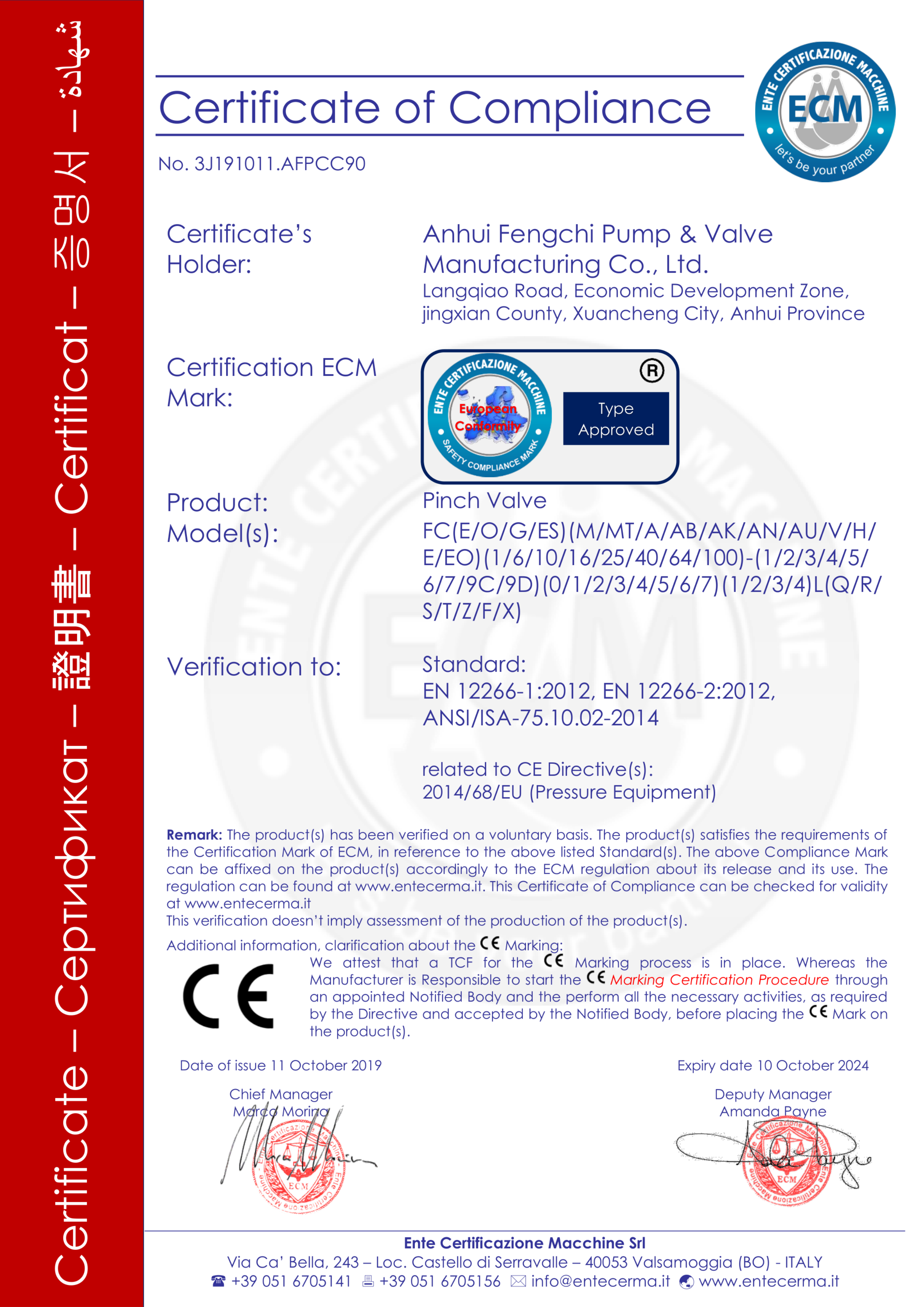 Anhui Fengchi pompklep Manufacturing Co., Ltd. heeft achtereenvolgens de ISO9001-2015 kwaliteitsmanagementsysteemcertificering, de ISO14000 milieumanagementsysteemcertificering, de ISO45001 gezondheids- en veiligheidsmanagementsysteemcertificering, de EU CE-certificering, de Rohs-certificering behaald.